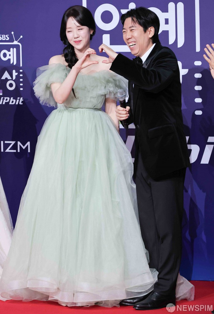 [서울=뉴스핌] 윤창빈 기자 = 예능 런닝맨(지예은, 양세찬) 출연진이 30일 서울 마포구 SBS프리즘타워에서 열린 2025 SBS 연예대상 포토월에서 포즈를 취하고 있다. 2025.12.30 pangbin@newspim.com