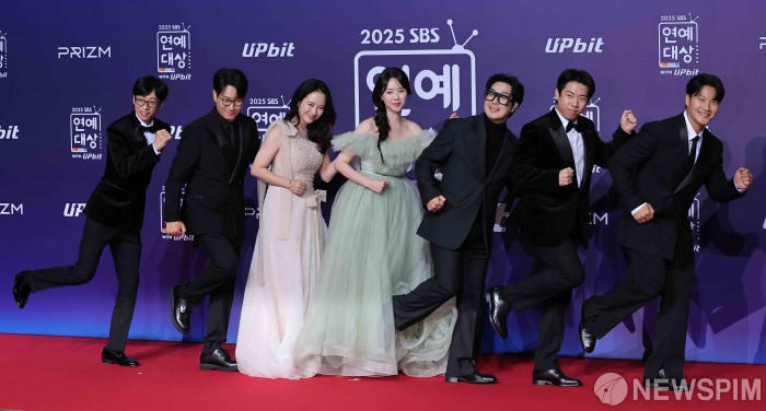 [서울=뉴스핌] 윤창빈 기자 = 예능 런닝맨(왼쪽부터 유재석, 지석진,송지효, 지예은, 하하, 양세찬, 김종국) 출연진이 30일 서울 마포구 SBS프리즘타워에서 열린 2025 SBS 연예대상 포토월에서 포즈를 취하고 있다. 2025.12.30 pangbin@newspim.com