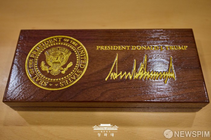 [서울=뉴스핌] 지난 30일 청와대가 공개한 ‘백악관 황금열쇠’. 도널드 트럼프 미국 대통령이 이재명 대통령에게 선물했다. [사진=청와대] 2025.12.31 photo@newspim.com