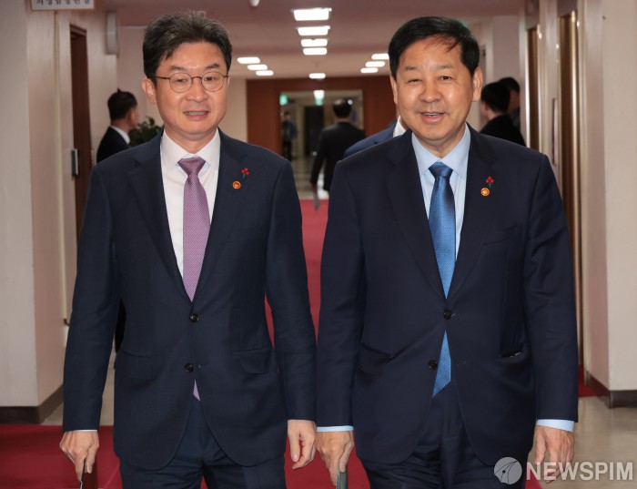 [서울=뉴스핌] 이길동 기자 =구윤철 부총리 겸 기획재정부 장관(오른쪽)과 이억원 금융위원장이 31일 서울 종로구 정부서울청사에서 열린 임시 국무회의에 참석하고 있다. 2025.12.31 gdlee@newspim.com
