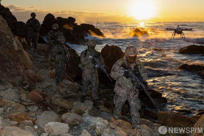 [삼척=뉴스핌] 류기찬 기자 = 26일 오전 강원 삼척시의 한 해안가에서 육군 제23경비여단 군 장병들이 경계용 드론을 이용한 수제선 정밀정찰 작전을 수행하고 있다. 경계용 드론은 군 장병들이 직접 접근하기 어려운 구역까지 하늘에서 살피며 빈틈없는 경계작전태세를 유지하는데 큰 도움을 주고 있다. 2025.12.26 ryuchan0925@newspim.com