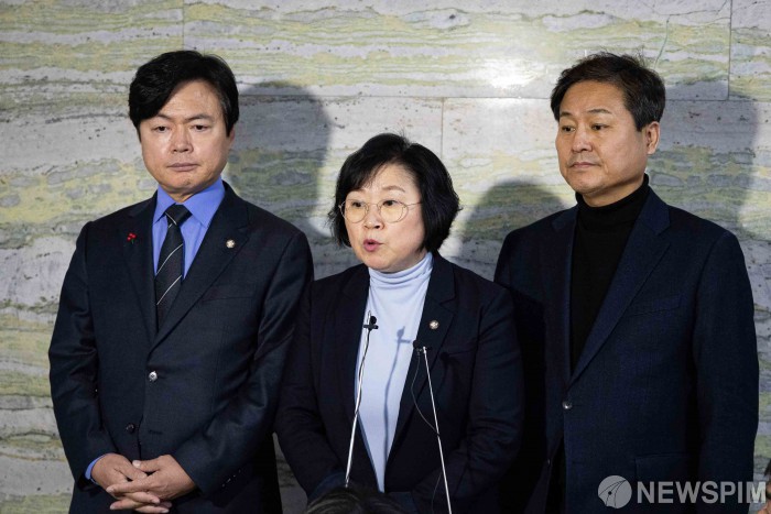 [서울=뉴스핌] 윤창빈 기자 = 국회 과학기술정보방송통신위원회 김현 더불어민주당 간사(가운데)와, 김영배 외교통일위원회 간사(오른쪽), 김현정 원내대변인이 31일 서울 여의도 국회 의안과에 쿠팡 불법행위 국정조사 요구서를 제출한 후 취재진 질문에 답하고 있다. 2025.12.31 pangbin@newspim.com