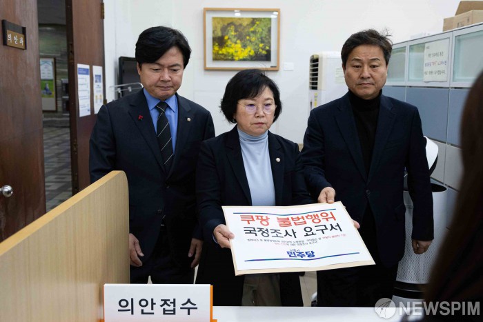 [서울=뉴스핌] 윤창빈 기자 = 국회 과학기술정보방송통신위원회 김현 더불어민주당 간사(가운데)와, 김영배 외교통일위원회 간사(오른쪽), 김현정 원내대변인이 31일 서울 여의도 국회 의안과에 쿠팡 불법행위 국정조사 요구서를 제출하고 있다. 2025.12.31 pangbin@newspim.com