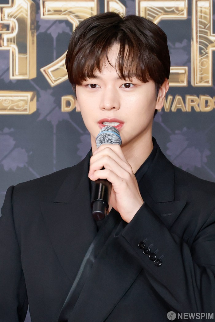 [서울=뉴스핌] 류기찬 기자 = 배우 육성재가 31일 오후 서울 마포구 SBS프리즘타워에서 열린 ‘2025 SBS 연기대상 시상식 포토월’에서 인사말을 하고 있다. 2025.12.31 ryuchan0925@newspim.com