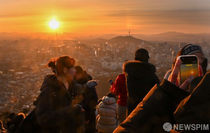 [서울=뉴스핌] 양윤모 기자 = 2026년 '붉은 말의 해' 병오년(丙午年) 첫날인 1일 서울 종로구 인왕산 정상에서 시민들이 일출을 휴대폰을 이용해 촬영하고 있다. 2026.01.01 yym58@newspim.com