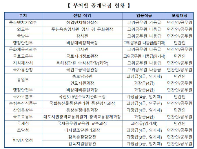 아울러 행정안전부 비상대비정책국장, 국토부 국토지리정보원장, 통일부 홍보담당관, 보훈부 국립5.18민주묘지관리소장, 산업통상부 통상분쟁대응과장, 국세청 국세공무원교육원 교수과장 등 6개 직위는 민간인재만 지원할 수 있다.