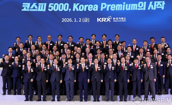[서울=뉴스핌] 최지환 기자 = 정은보 한국거래소 이사장을 비롯한 참석자들이 2일 오전 서울 영등포구 한국거래소 서울사무소에서 열린 2026년도 증권·파생상품시장 개장식에서 기념촬영을 하고 있다. 앞줄 왼쪽부터 김영재 상장회사협의회장, 김학수 넥스트레이드 사장, 황성엽 금융투자협회장, 오기형 코스피 5000 특위위원장, 정은보 한국거래소 이사장, 이억원 금융위원장, 김상훈 밸류업특위위원장, 이찬진 금융감독원장, 이동훈 코스닥협회장, 황창순 코넥스협회장. 2026.01.02 choipix16@newspim.com