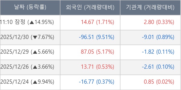 [장중수급포착] 현대무벡스, 외국인/기관 동시 순매수… 주가 +14.95%