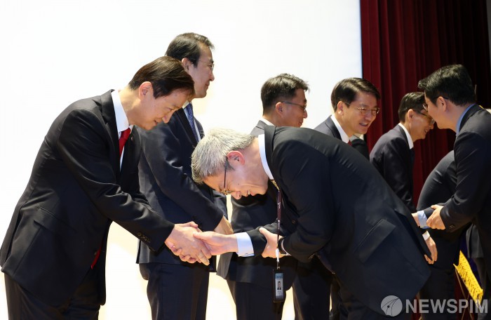 [서울=뉴스핌] 최지환 기자 = 이찬진 금융감독원장이 2일 오전 서울 영등포구 금융감독원에서 열린 금융감독원 시무식에서 임직원들과 신년인사를 하고 있다. 2026.01.02 choipix16@newspim.com