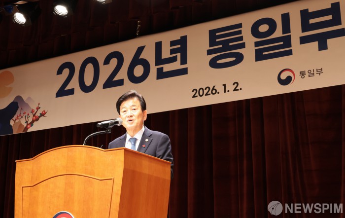 [서울=뉴스핌] 이길동 기자 = 정동영 통일부 장관이 2일 서울 종로구 정부서울청사에서 열린 2026년 통일부 시무식에서 신년사를 하고 있다.2026.01.02 gdlee@newspim.com