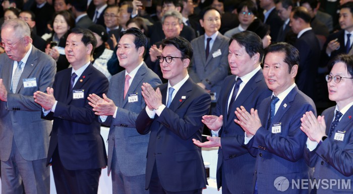 [서울=뉴스핌] 사진공동취재단 = 김민석 국무총리와 최태원 대한상공회의소 회장, 정청래 더불어민주당·장동혁 국민의힘 대표 등 참석자들이 2일 오후 서울 중구 대한상공회의소에서 열린 2026 경제계 신년인사회에서 기념촬영을 마치고 박수를 치고 있다. 2026.01.02 photo@newspim.com