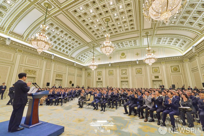 [서울=뉴스핌] 이재명 대통령이 2일 서울 종로구 청와대 영빈관에서 열린 시무식에서 인사말을 하고 있다. [사진=청와대] 2026.01.02 photo@newspim.com