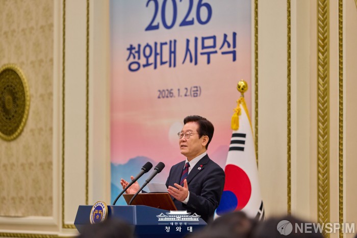 [서울=뉴스핌] 이재명 대통령이 2일 서울 종로구 청와대 영빈관에서 열린 시무식에서 인사말을 하고 있다. [사진=청와대] 2026.01.02 photo@newspim.com