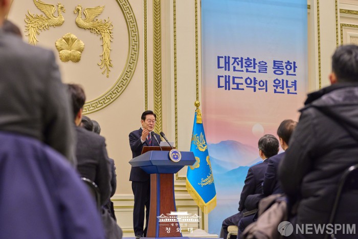 [서울=뉴스핌] 이재명 대통령이 2일 서울 종로구 청와대 영빈관에서 열린 시무식에서 인사말을 하고 있다. [사진=청와대] 2026.01.02 photo@newspim.com