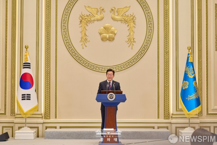 [서울=뉴스핌] 이재명 대통령이 2일 서울 종로구 청와대 영빈관에서 열린 2026년 신년인사회에서 인사말을 하고 있다. [사진=청와대] 2026.01.02 photo@newspim.com