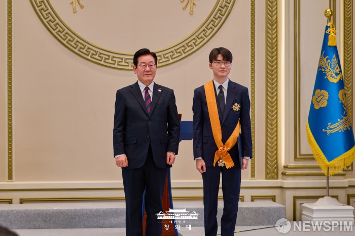 [서울=뉴스핌] 이재명 대통령이 2일 서울 종로구 청와대 영빈관에서 열린 2026년 신년인사회에서 ‘페이커’ 이상혁 선수에게 체육훈장 청룡장을 수여하고 있다. [사진=청와대] 2026.01.02 photo@newspim.com