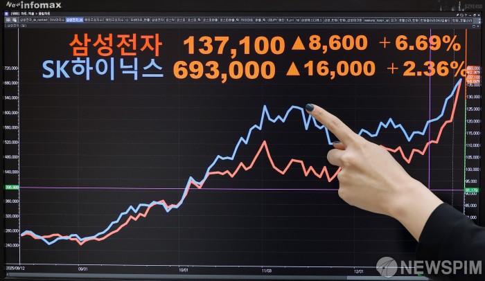 [서울=뉴스핌] 류기찬 기자 = 삼성전자와 SK하이닉스의 주가가 장중 신고가를 경신한 5일 오후 서울 여의도 한국거래소 서울사무소 홍보관에 지수가 표시되고 있다. 2026.01.05 ryuchan0925@newspim.com