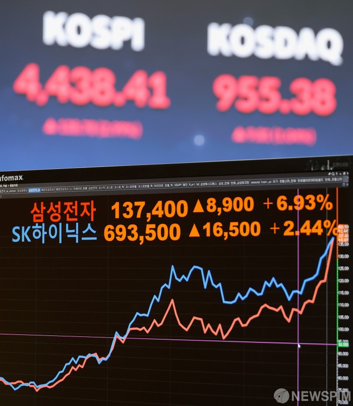 [서울=뉴스핌] 류기찬 기자 = 삼성전자와 SK하이닉스의 주가가 장중 신고가를 경신한 5일 오후 서울 여의도 한국거래소 서울사무소 홍보관에 지수가 표시되고 있다. 2026.01.05 ryuchan0925@newspim.com