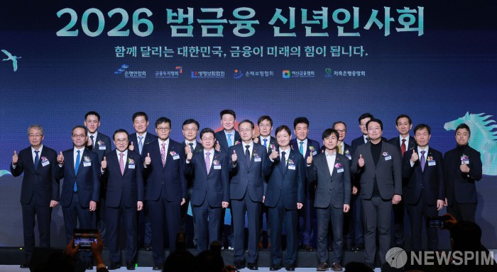 [서울=뉴스핌] 양윤모 기자 = 새해 금융업계의 현안과 비전을 공유하는 연례 행사인 '2026 범금융 신년인사회'가 5일 오후 서울 중구 소공동 롯데호텔에서 개최된 가운데 참석자들이 기념촬영을 하고 있다. 행사에는 이형일 재정경제부 1차관,이억원 금융위원장,이찬진 금융감독원장,이창용 한국은행 총재 등 정부 인사, 국회 정무·기획재정위원회 의원, 함영주 하나금융회장등 5대 금융지주 회장, 은행·증권·보험·카드·저축은행 최고경영자(CEO) 등 약 400여 명이 참석했다. [공동취재] 2026.01.05 yym58@newspim.com