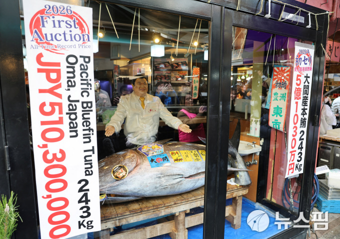 5일 일본 도쿄 도요스 수산시장에서 열린 2026년 새해 첫 경매에서 5억1030만엔(약 47억원)에 낙찰된 243킬로그램 참치가 초밥전문점 스시잔마이에 전시돼 있다. [사진=로이터 뉴스핌]