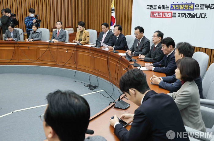 [서울=뉴스핌] 윤창빈 기자 = 송언석 국민의힘 원내대표가 6일 서울 여의도 국회에서 열린 원내대책회의에서 모두발언을 하고 있다. 2026.01.06 pangbin@newspim.com