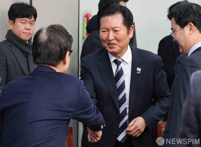 [서울=뉴스핌] 윤창빈 기자 = 정청래 더불어민주당 대표가 6일 서울 여의도 국회에서 열린 충남·대전통합 및 충청지역 발전특별위원회 제2차 전체회의에서 박범계 공동위원장과 인사를 하고 있다. 2026.01.06 pangbin@newspim.com