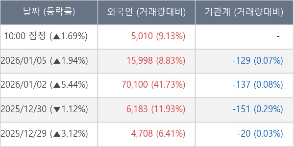[서울=뉴스핌] 로보뉴스 = 06일 10시 15분 현재 라온텍(418420)은 전일 대비 1.69% (현재가 4,820원) 상승했고, 외국인이 최근 5일 연속 순매수(누적 10.20만 주, 잠정) 행진을 하고 있다.