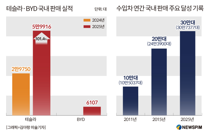 [서울=뉴스핌] 정승원 기자 = 국내 연간 수입차 판매량이 처음으로 30만대를 넘어섰다. 모델 Y를 앞세운 테슬라가 전년 대비 큰 폭으로 판매량이 성장하고 중국 브랜드 BYD가 국내 판매를 시작하며 첫 수입차 30만대 시대를 연 것이다.