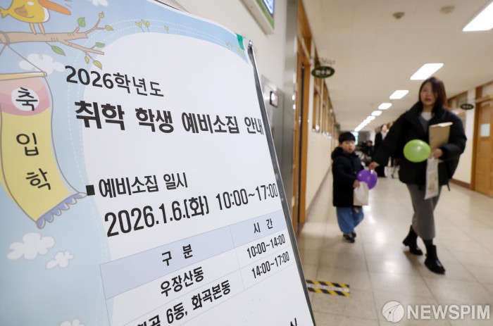 [서울=뉴스핌] 정일구 기자 = 2026학년도 초등학교 신입생 예비소집일인 6일 오후 서울 강서구 우장초등학교에서 예비 초등학생과 학무모가 취학통지서 접수를 마치고 이동하고 있다. 2026.01.06 mironj19@newspim.com