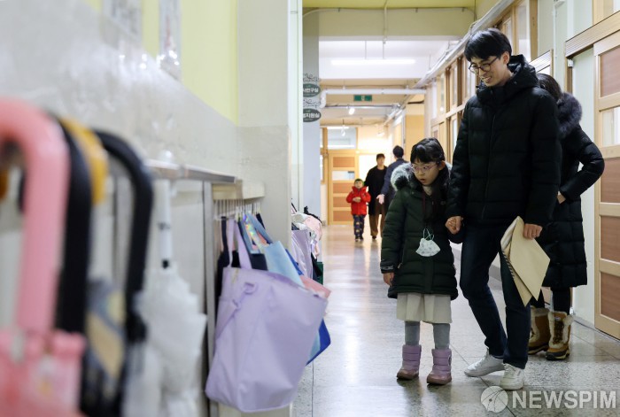 [서울=뉴스핌] 정일구 기자 = 2026학년도 초등학교 신입생 예비소집일인 6일 오후 서울 강서구 우장초등학교에서 예비 초등학생과 학부모가 1학년 교실을 둘러보고 있다. 2026.01.06 mironj19@newspim.com
