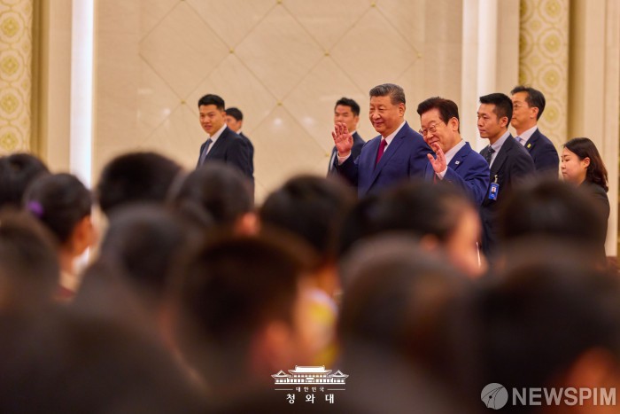 [서울=뉴스핌] 이재명 대통령이 지난 5일 중국 베이징 인민대회당에서 시진핑(習近平) 중국 국가주석과 정상회담을 위해 이동하고 있다. [사진=청와대] 2026.01.06 photo@newspim.com
