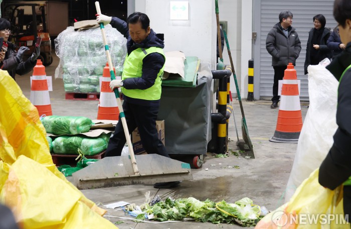 [서울=뉴스핌] 정일구 기자 = 정청래 더불어민주당 대표가 7일 오전 서울 송파구 가락동 농수산물도매시장 채소2동을 현장 방문해 생활쓰레기 등 환경미화 봉사를 하고 있다. 2026.01.07 mironj19@newspim.com