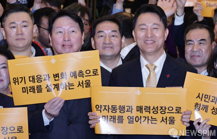 [서울=뉴스핌] 양윤모 기자 = 7일 오전 서울 중구 대한상공회의소 국제회의장에서 개최된 '2026년 서울시 신년인사회' 참석자들이 퍼포먼스를 하며 기념촬영을 하고 있다. 행사에는 오세훈 서울시장, 최태원 서울상의 회장, 최호정 서울시의회 의장, 정근식 서울시교육감, 서영교 더불어민주당 국회의원, 나경원 국민의힘 국회의원,구청장 등 800여명이 참석했다. 2026.01.07 yym58@newspim.com