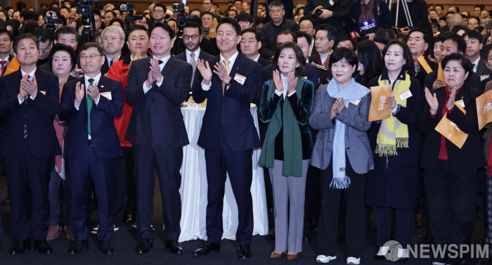 [서울=뉴스핌] 양윤모 기자 = 7일 오전 서울 중구 대한상공회의소 국제회의장에서 개최된 '2026년 서울시 신년인사회' 참석자들이 박수를 치고 있다. 행사에는 오세훈 서울시장, 최태원 서울상의 회장, 최호정 서울시의회 의장, 정근식 서울시교육감, 서영교 더불어민주당 국회의원, 나경원 국민의힘 국회의원,구청장 등 800여명이 참석했다. 2026.01.07 yym58@newspim.com