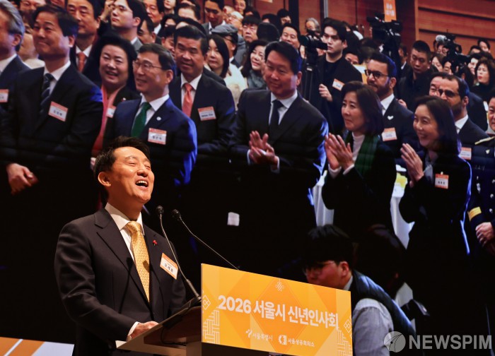 [서울=뉴스핌] 양윤모 기자 = 오세훈 서울시장이 7일 오전 서울 중구 대한상공회의소 국제회의장에서 개최된 '2026년 서울시 신년인사회'에 참석해 신년사회에 참석해 신년사중 지지자들이 "오세훈 화이팅"을 외치자 환하게 웃고 있다.행사에는 오 서울시장, 최태원 서울상의 회장, 최호정 서울시의회 의장, 정근식 서울시교육감, 서영교 더불어민주당 국회의원, 나경원 국민의힘 국회의원,구청장 등 800여명이 참석했다. 2026.01.07 yym58@newspim.com