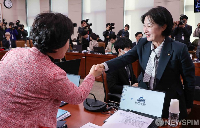 [서울=뉴스핌] 윤창빈 기자 = 추미애 국회 법제사법위원장이 7일 서울 여의도 국회에서 열린 법제사법위원회 전체회의에서 국민의힘 의원들과 새해 인사를 나누고 있다. 2026.01.07 pangbin@newspim.com