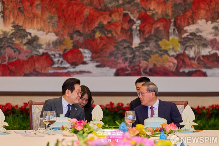[서울=뉴스핌] 이재명 대통령이 지난 6일 오전 중국 베이징 댜오위타이(조어대·釣魚臺)에서 리창 총리와 오찬을 하고 있다. [사진=청와대] 2026.01.07 photo@newspim.com