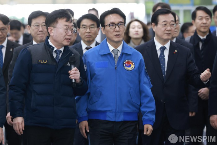[서울=뉴스핌]김민석 국무총리가 7일 경남 사천 한국항공우주산업(KAI)을 방문해, 관계자의 설명을 들으며 현장을 시찰하고 있다. [사진=총리실] 2026.01.07 photo@newspim.com