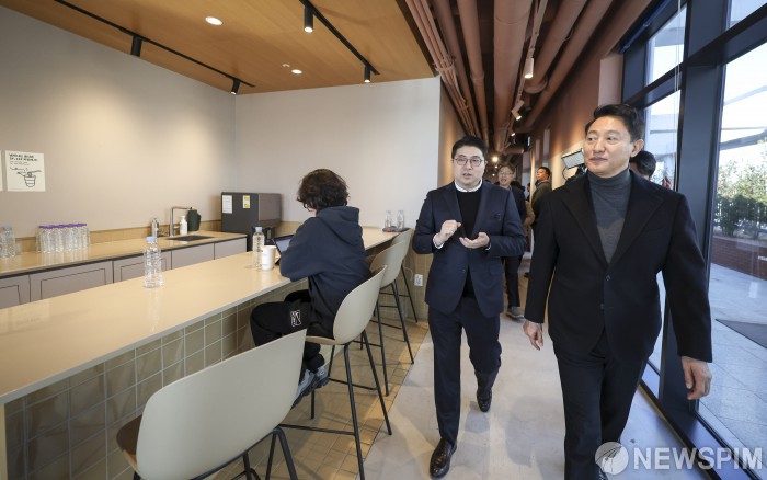 [서울=뉴스핌] 양윤모 기자 = 오세훈 서울시장이 8일 오전 기업형 민간임대주택인 서울 마포구 '맹그로브 신촌'을 방문해 조강태 MGRV 대표의 안내로 라운지 공간을 둘러보고 있다. [공동취재] 2026.01.08 yym58@newspim.com