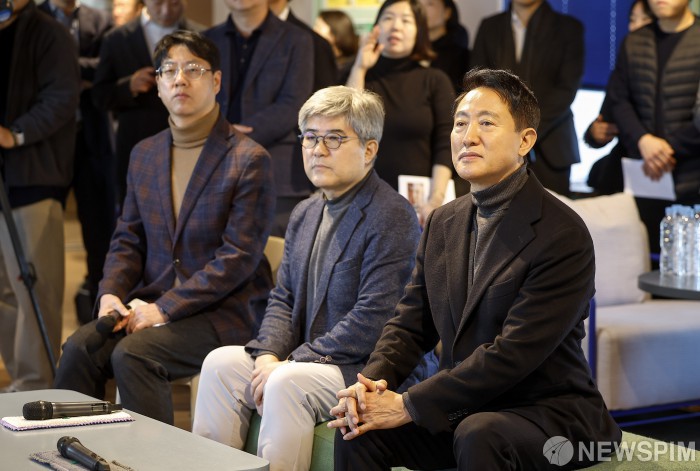 [서울=뉴스핌] 양윤모 기자 = 오세훈 서울시장이 8일 오전 서울 마포구 기업형 민간임대주택인 '맹그로브 신촌'을 찾아 현장점검을 마친 뒤 열린 간담회에서 조강태 MGRV 대표의 안내로 기업형 민간임대주택 관련 설명을 듣고 있다. [공동취재] 2026.01.08 yym58@newspim.com