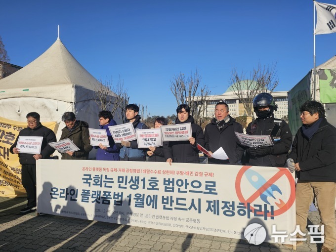8일 참여연대 등이 함께한 온라인플랫폼법제정촉구공동행동(공동행동)은 서울 여의도 국회의사당 앞에서 이른바 '쿠팡갑질방지법'으로 불리는 '온라인 플랫폼법(온플법)' 1월 임시 국회 내 제정 촉구 기자회견을 진행했다.