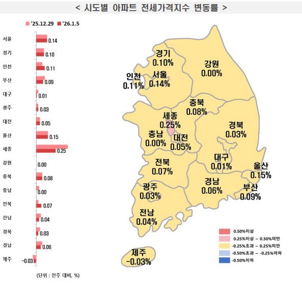 8일 한국부동산원의 2026년 1월 1주(1월5일 기준) 전국 주간 아파트가격 동향 조사 매매가격은 0.06% 상승하고 전세가격은 0.08% 상승을 각각 기록했다.