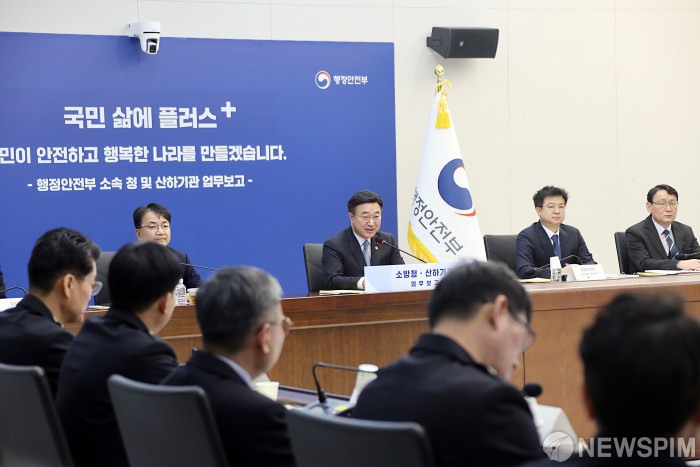 [서울=뉴스핌]윤호중 행정안전부 장관이 8일 오전 정부세종청사 중앙동에서 열린 2026년 소방청 업무보고에서 모두 발언을 하고 있다.[사진=행정안전부] 2026.01.08 photo@newspim.com