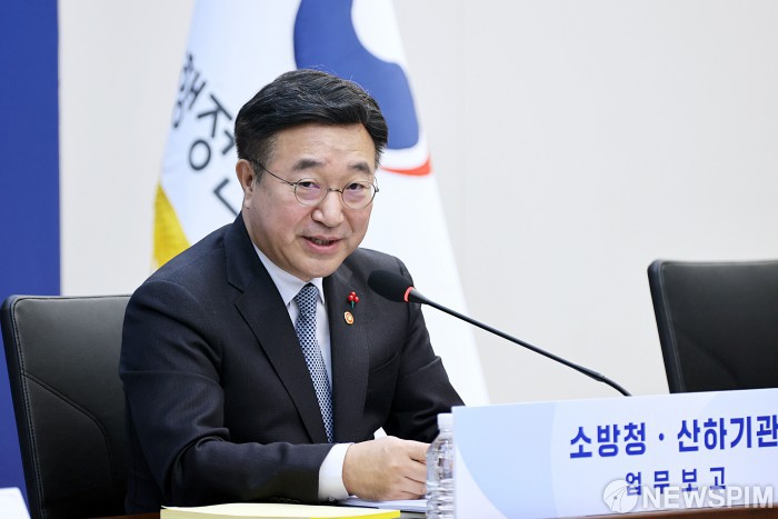 [서울=뉴스핌]윤호중 행정안전부 장관이 8일 오전 정부세종청사 중앙동에서 열린 2026년 소방청 업무보고에서 모두 발언을 하고 있다.[사진=행정안전부] 2026.01.08 photo@newspim.com