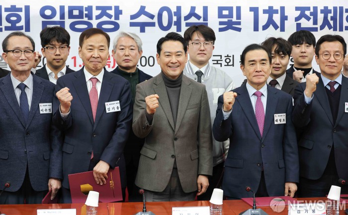 [서울=뉴스핌] 윤창빈 기자 = 장동혁 국민의힘 대표가 8일 서울 여의도 국회에서 열린 통일위원회 임명장 수여식에서 김기웅 위원장 등 참석자들과 기념촬영을 하고 있다. 2026.01.08 pangbin@newspim.com