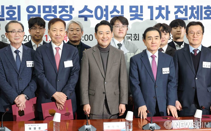 [서울=뉴스핌] 윤창빈 기자 = 장동혁 국민의힘 대표가 8일 서울 여의도 국회에서 열린 통일위원회 임명장 수여식에서 김기웅 위원장 등 참석자들과 기념촬영을 하고 있다. 2026.01.08 pangbin@newspim.com
