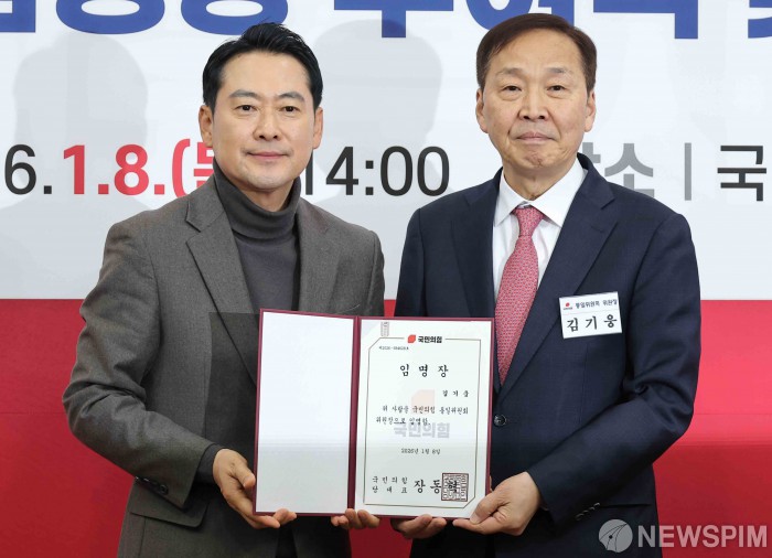 [서울=뉴스핌] 윤창빈 기자 = 장동혁 국민의힘 대표가 8일 서울 여의도 국회에서 열린 통일위원회 임명장 수여식에서 김기웅 위원장에게 임명장을 수여하고 있다. 2026.01.08 pangbin@newspim.com