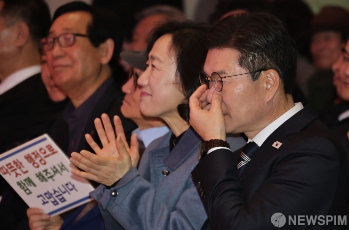 [서울=뉴스핌] 양윤모 기자 = 정원오 성동구청장이 8일 오후 서울 성동구 행당동 성동구청 대강당에서 개최된 '2026 성동구 신년인사회'에 참석해 구민들의 손팻말 문구에 감사하며 눈물을 감추고 있다. 더불어민주당 서울시장 후보군으로 거론되는 정원오 성동구청장은 최근 서울의 주택 공급 부족 현상은 오세훈 서울시장으로부터 비롯됐다고 직격했다. 2026.01.08 yym58@newspim.com