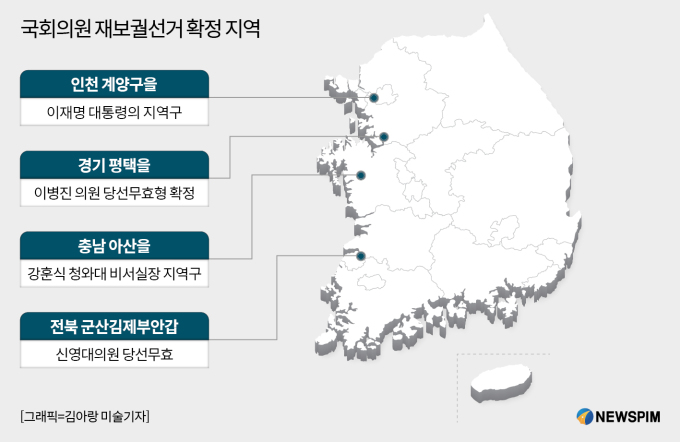 이에 따라 재보궐선거 확정 지역은 ▲이재명 대통령의 지역구인 인천 계양을 ▲강훈식 청와대 비서실장의 지역구인 충남 아산을 ▲경기 평택을(이병진 의원) ▲전북 군산김제부안갑(신영대 의원) 총 4곳으로 늘어났다.