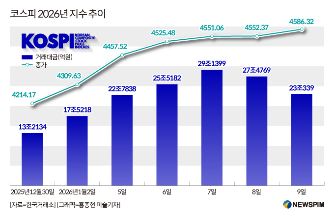 11일 한국거래소에 따르면 2026년 1월 들어 코스피는 6거래일 연속 종가 기준 사상 최고치를 경신했다. 코스피 지수는 첫 거래일인 2일 4413.63에서 출발해 3일 4389.24로 소폭 조정을 받았으나, 6일 4525.48, 7일 4551.06, 8일 4552.37로 연속 고점을 갈아치웠다. 9일에도 4586.32로 마감하며 추가 상승했다. 연초 첫 주에만 약 7.05% 상승하며 4500선을 넘어섰고, 장중 4600선까지 돌파했다.
